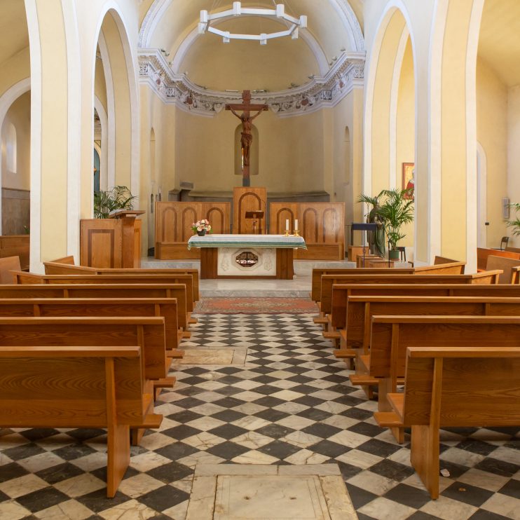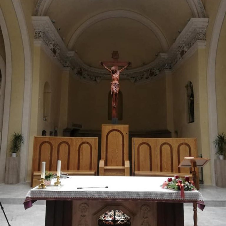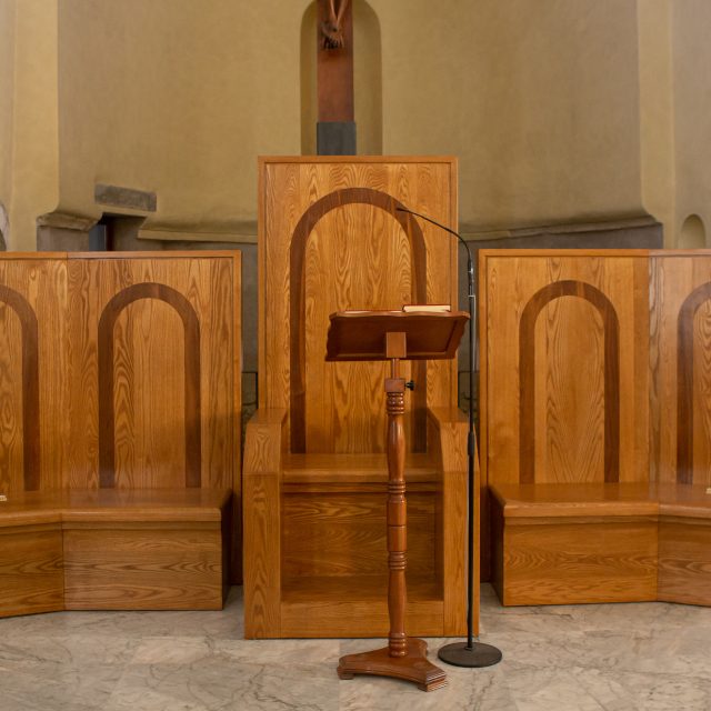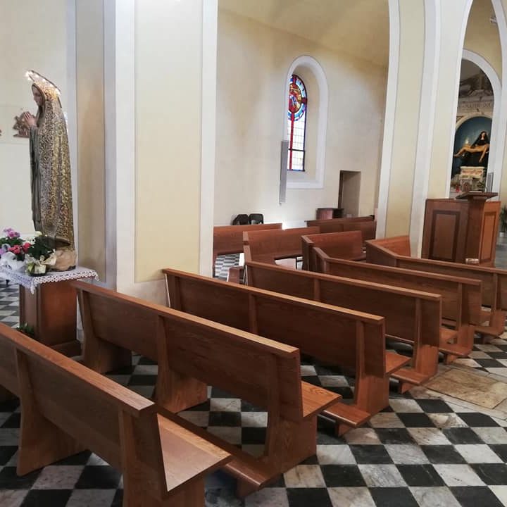 In particolare sono stati realizzati l’ambone, le sedute del presbiterio, le sedute per i ministranti, i banchi dell’assemblea, le sedute della cappella del SS, la pedana di allestimento del fonte battesimale, gli elementi lignei per la definizione di nicchie delle statue di vari santi e della teca delle reliquie di S. Severo. Tutto è stato realizzato in legno massello di castagno di prima scelta e stagionato da almeno due anni.
